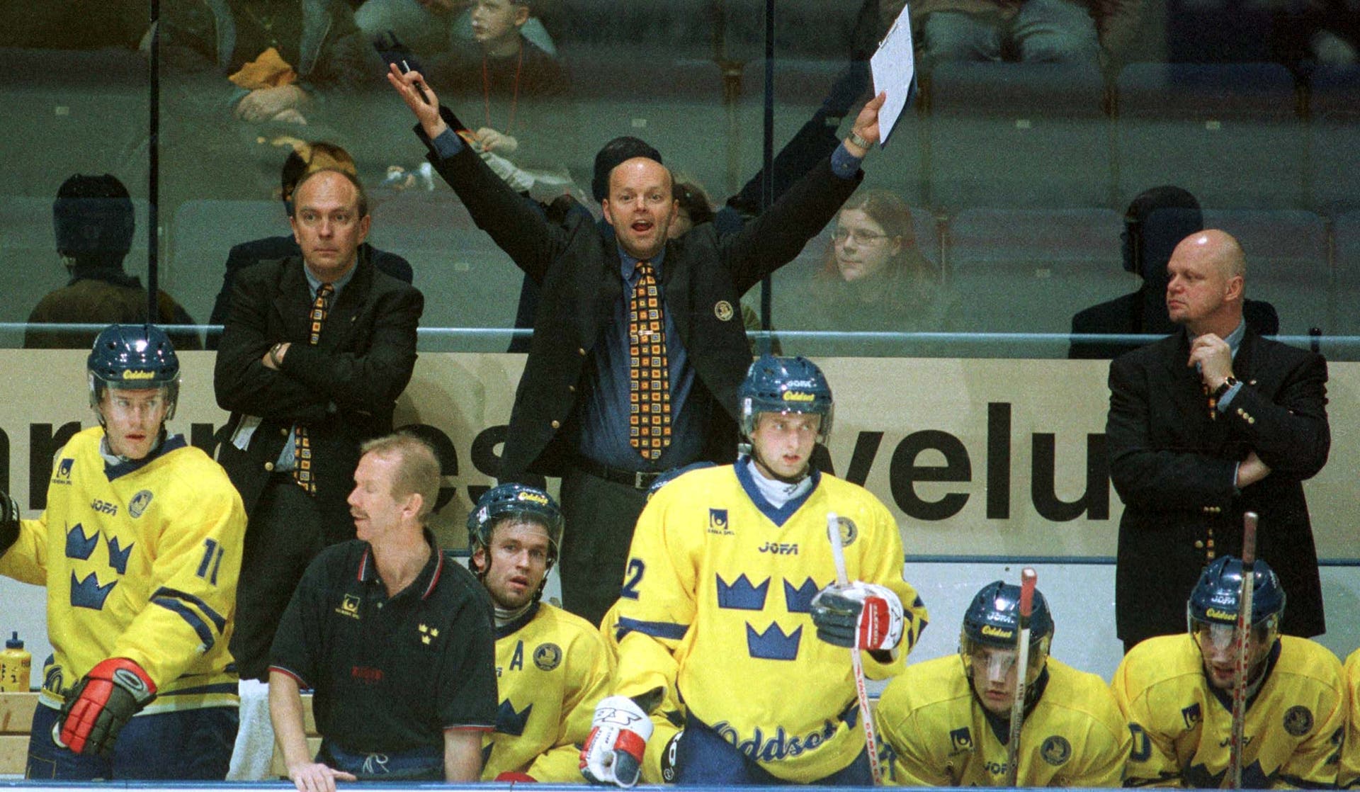 Peter Wallin i Tre Kronors bås under sin tid som General Manager, flankerad av Sune Bergman och Roger Melin.