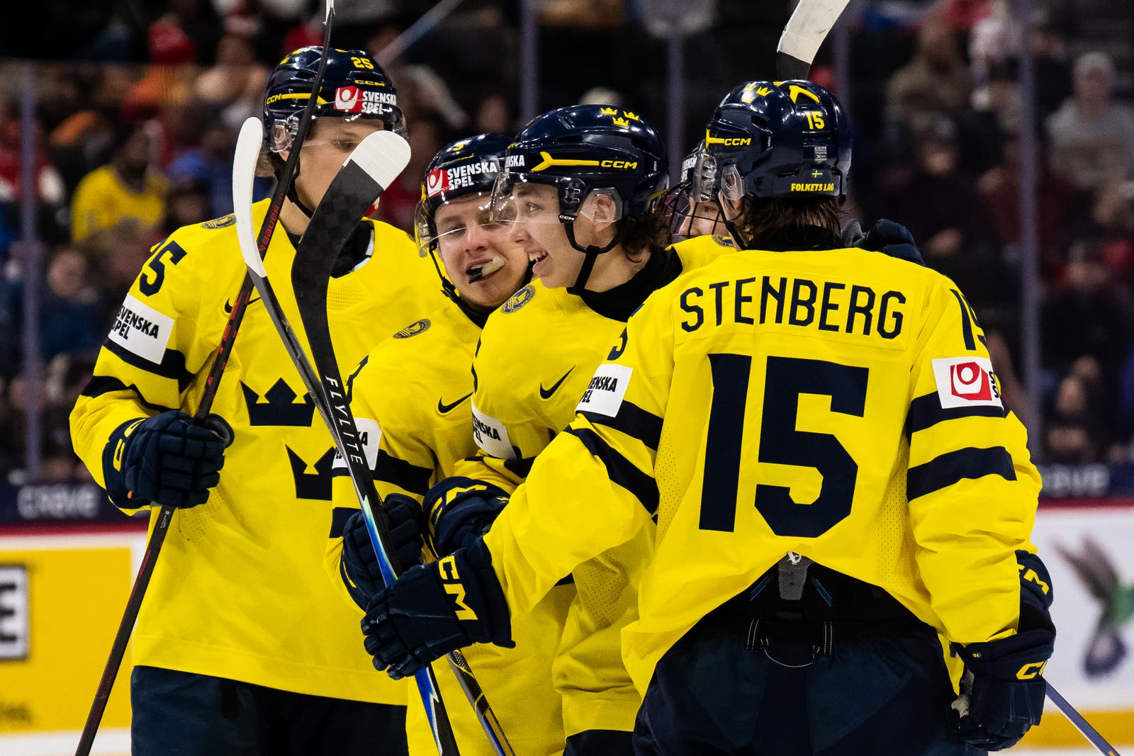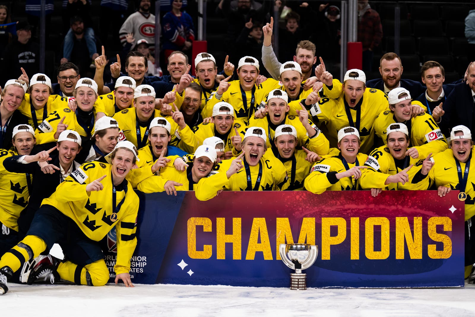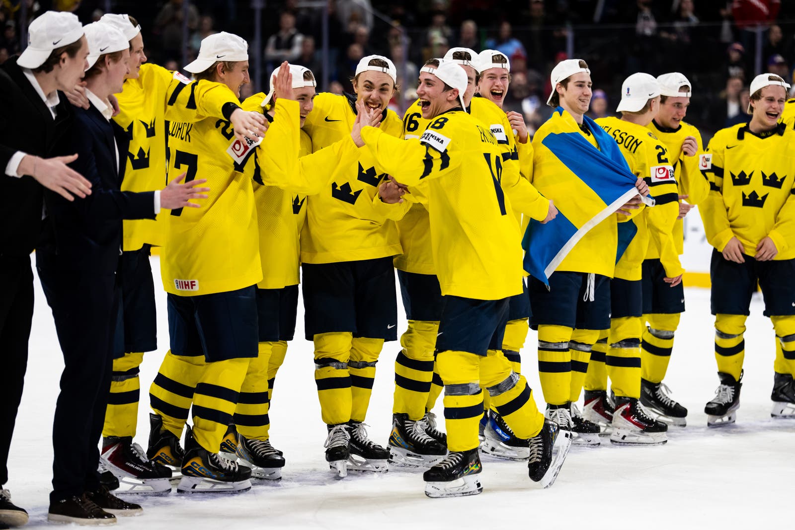 Juniorkronorna vinner JVM-finalen mot Tjeckien med 4–2. Glädjen är total när Jack Berglund lyfter pokalen – Sveriges tredje JVM-guld någonsin. Här är några bilder från guldfirandet.