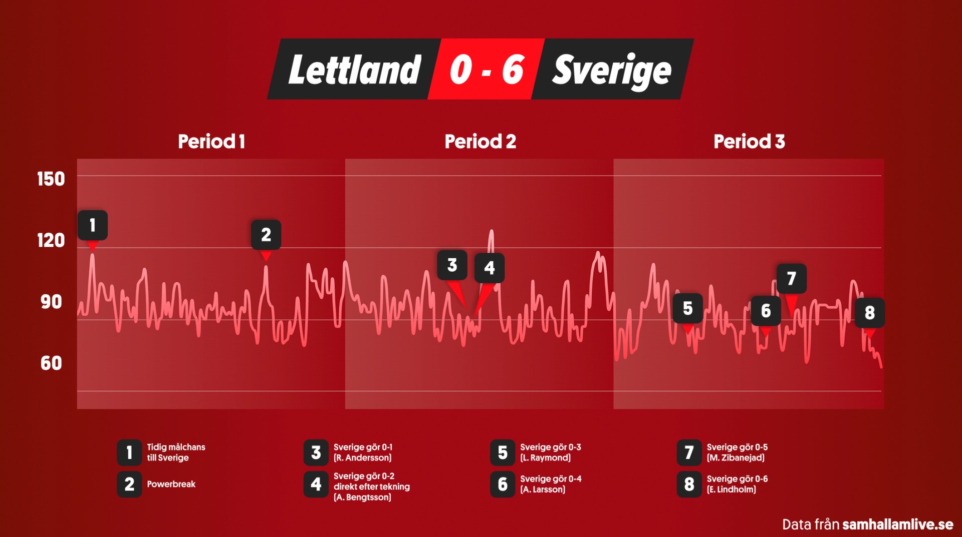 Under hockey-VM får hela världen möjligheten att ta pulsen på Tre Kronors förbundskapten Sam Hallam. Hur såg hans pulstoppar och dalar ut under matchen mot Lettland?