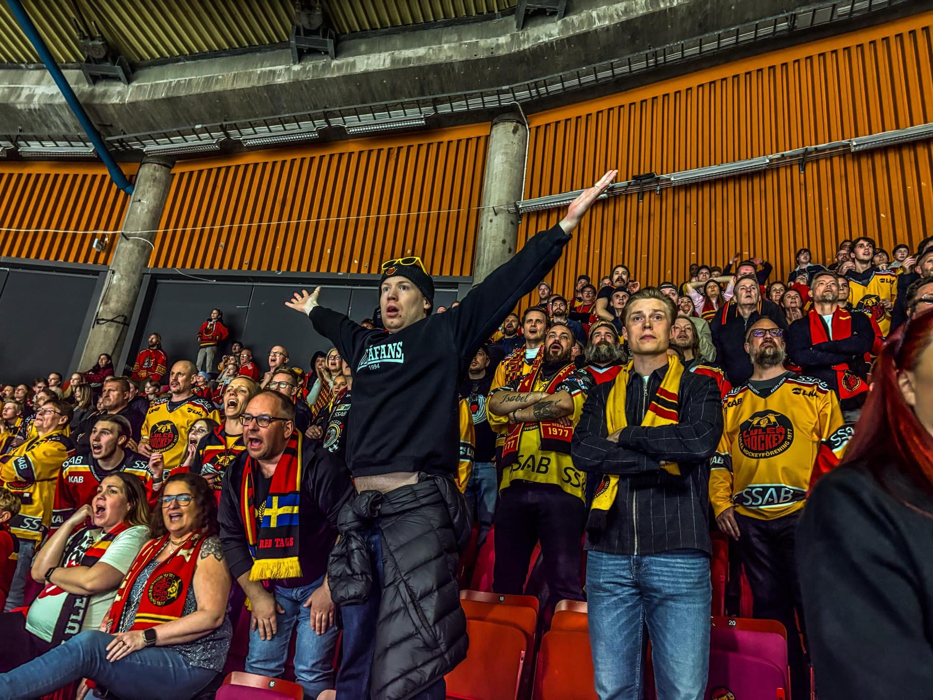 När jag frågar runt vart folk reser från hörs orter som Kungälv, Borås och Kalmar. Även en supporter från Nässjö har sökt sig hit, och förkunnar på klingande småländska att han hejat på Luleå sedan 1995. Luleå engagerar brett, om än det stora flertalet i den samlade skaran verkar vara norrbottningar i exil på västkusten. Rent dialektalt plockar jag även upp såväl Arjeplog som Piteå i skaran.