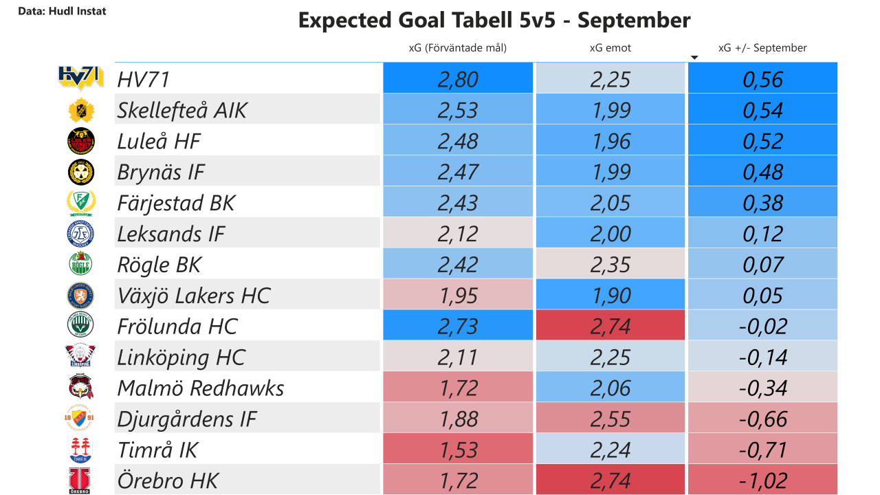 September månad är över och Hockeynews statistikexpert Anton Jansson analyserar hur SHL-lagen har levererat sett till förväntade mål framåt och emot.